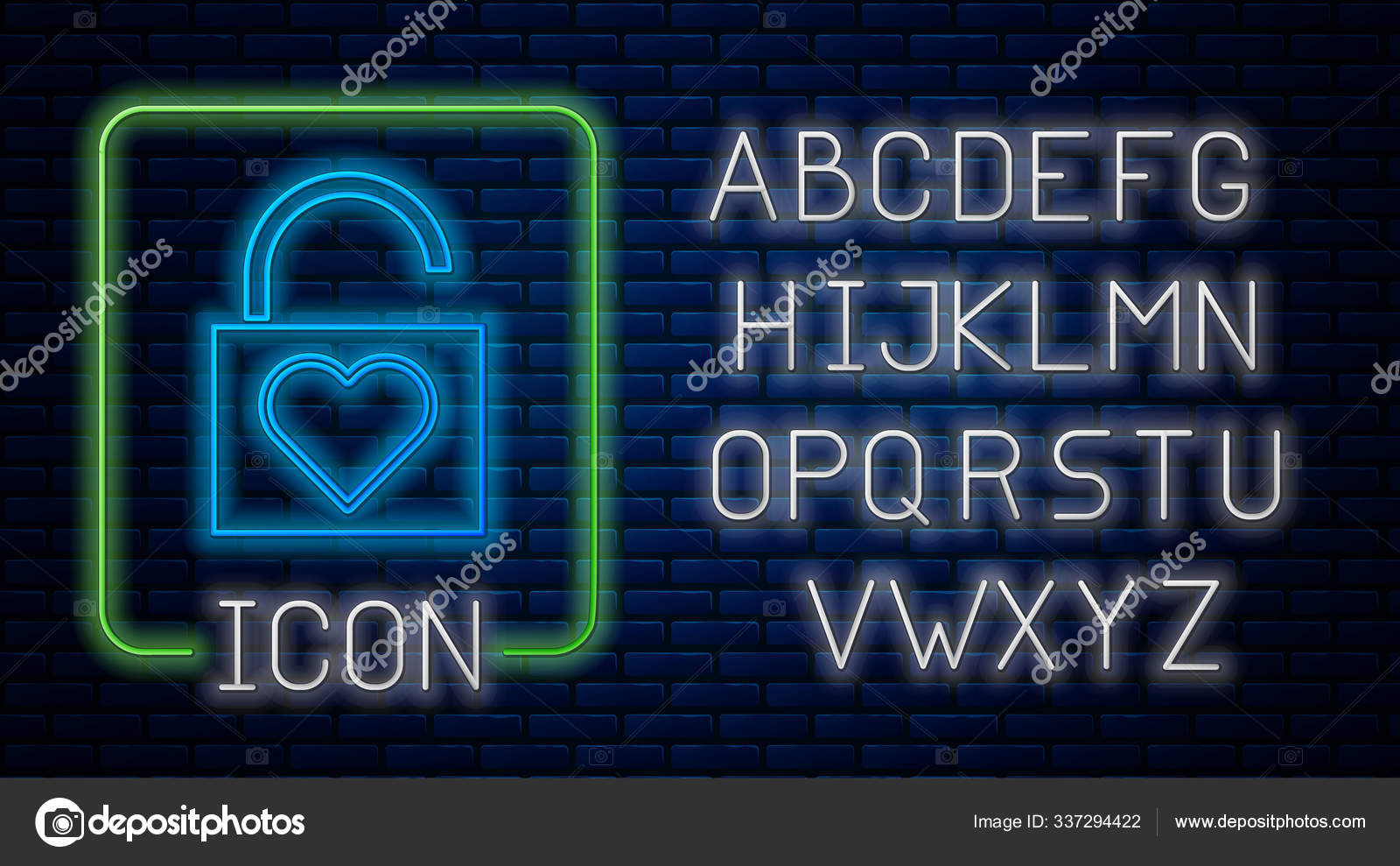 レンガの壁の背景に隔離されたネオンロックとハートアイコンを輝く 心をロックした愛のシンボルと鍵穴の標識バレンタインデーのシンボル ネオンライトアルファベットベクターイラスト — ストックベクター © vectorvalera@gmail.com #337294422